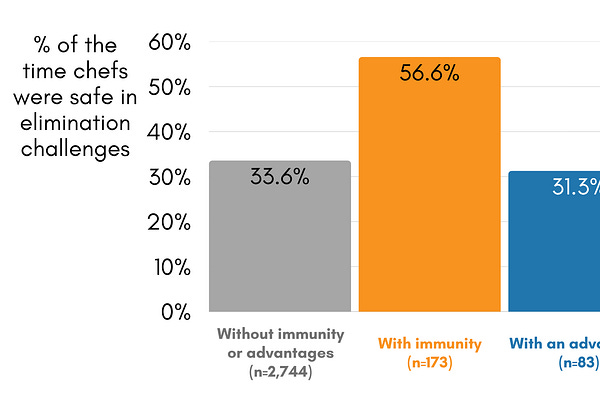 Last week, I shared that having an advantage in Top Chef elimination challenges is associated with better outcomes. Today, I’m going to dig into some…