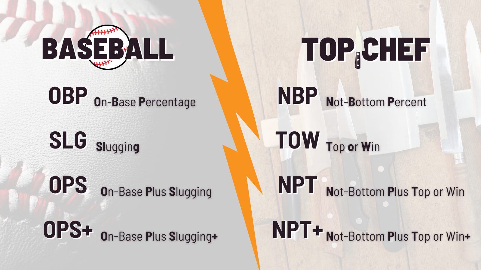 NPT+ (Not bottom Plus Top or win Plus) is the Top Chef equivalent of OPS+. It takes into account the “league” average (where all of Top Chef US is the league) of each of NBP and TOW. An NPT+ score of 100 is the league average; a score of 150 is 50% better than league average. A difference between NPT+ and OPS+ is that OPS+ is the league’s average for a specific year. However, because there are hundreds of players in an MLB year, and only 12-18 in a Top Chef season (year), I decided to have the Top Chef league average be across all seasons in order to reduce statistical noise. (Note that people’s NPT+ will change slightly as new seasons are aired.)
