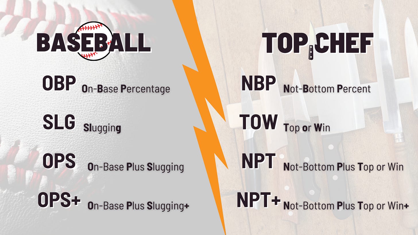 I’m not much of a sports person, but I have so much respect for sports statistics. Now, I can’t take credit for this new Top Chef statistic I’m introducing - all credit goes to my partner. His love of baseball inspired this, and then we talked about what the Top Chef equivalent would be.