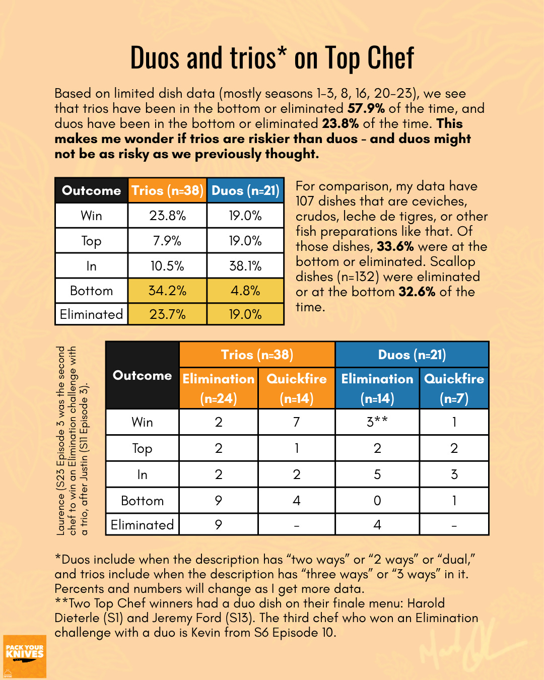 The question stems from the commonly accepted opinion that if a chef creates a duo or trio, they’re giving the judges food to compare against and it ends up hurting the chef more than helping.