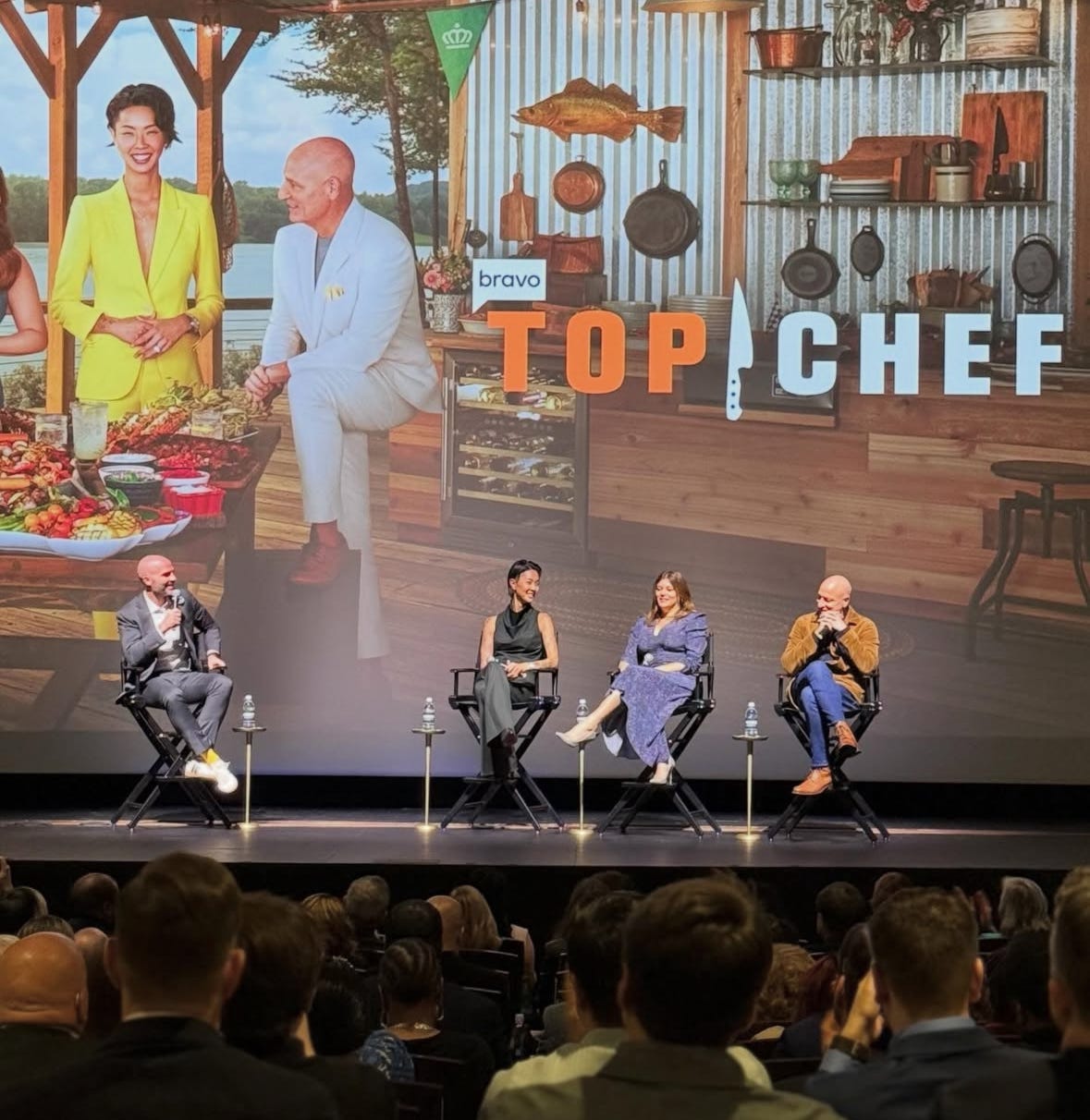 This is Monday night, and Kristen and I were sitting at a table in a fourth floor hall above the beautifully refurbished Carolina Theater in Uptown Charlotte (remember, Uptown Charlotte = downtown Charlotte). Next to us: Gail Simmons and Tom Colicchio. Below us: 800+ people would soon be shuffling to their seats to watch the season premiere of Top Chef Season 23: Carolinas. I had 10 minutes with the Top Chef judges before we took the stage for a fireside chat.