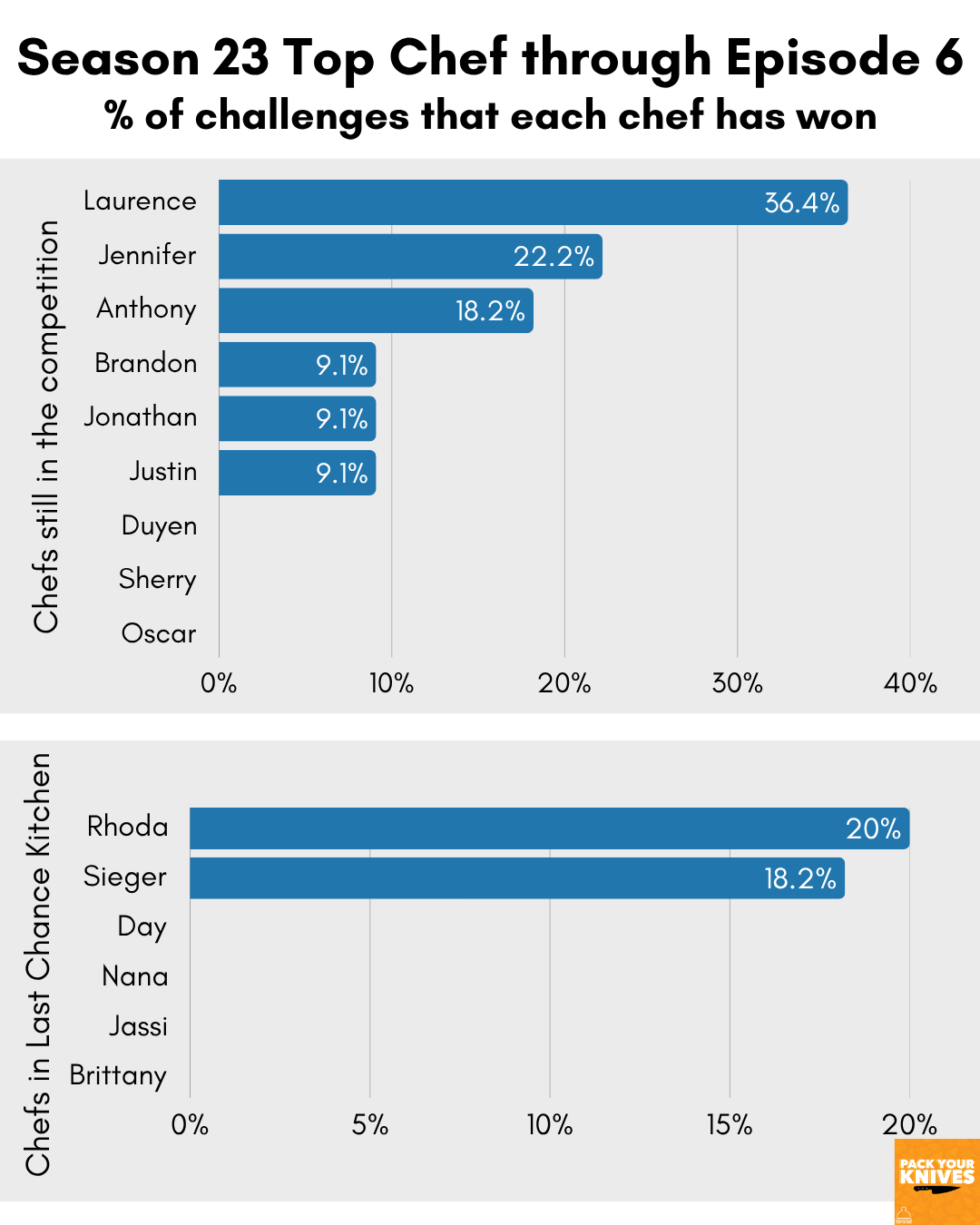 An easy way to see if there is a front runner is to look at the percent of challenges that chefs have won. (I’m not sure why Melissa King’s 41% win rate is seared into my brain from Season 17!)